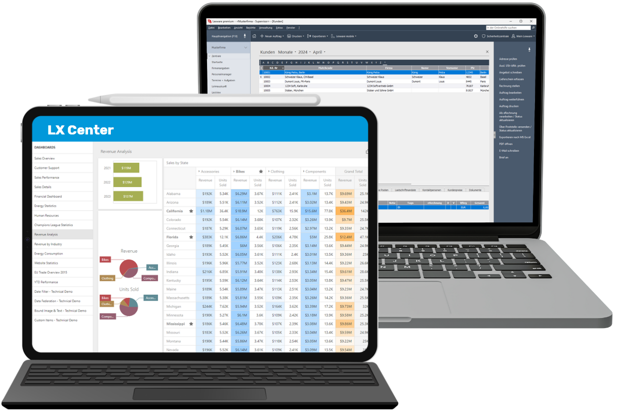 mit bidirektionaler Lexware-Anbindung. LX Center hat Zugriff auf deine Lexware-Daten und stellt den Benutzern in deinem Unternehmen eine moderne Web-Oberfläche zur Verfügung. Deine speziellen Anforderungen und Vorstellungen realisieren wir gemeinsam auf der Plattform, indem wir die vorhandenen Lexware-Daten anzeigen, neue Datenfelder und ganze Datenstrukturen ergänzen und Workflows und automatische Prozesse einrichten.
